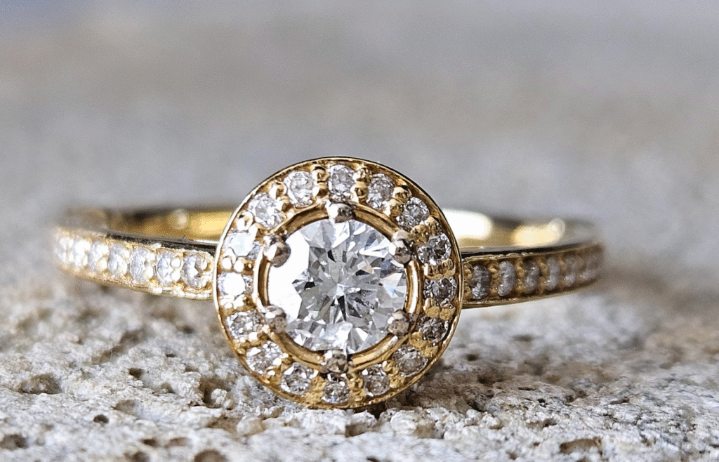 - Halo – centralny kamień otoczony mniejszymi diamentami dla efektu powiększenia.