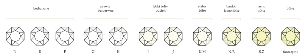 - Color (Kolor) – oceniany w skali od D (bezbarwny) do Z (z wyraźnym żółtym lub brązowym odcieniem). Najbardziej pożądane są diamenty bezbarwne (D-F), ponieważ odbijają najwięcej światła i mają największą wartość. Niektóre diamenty mogą mieć też barwy fantazyjne, np. różowe, niebieskie czy zielone, które są bardzo rzadkie i cenne. Barwa, zaraz po szlifie, w największym stopniu wpływa na wygląd diamentu.