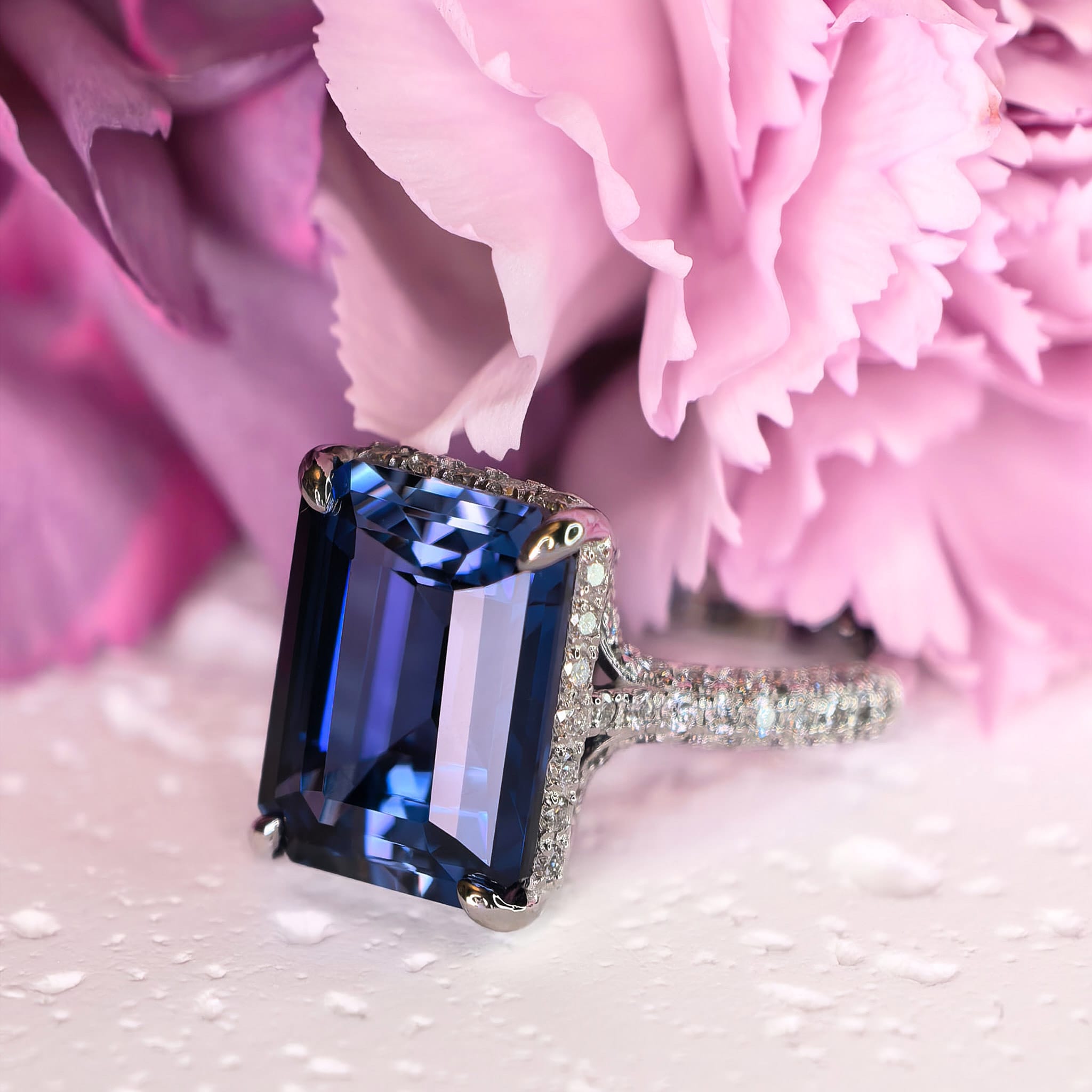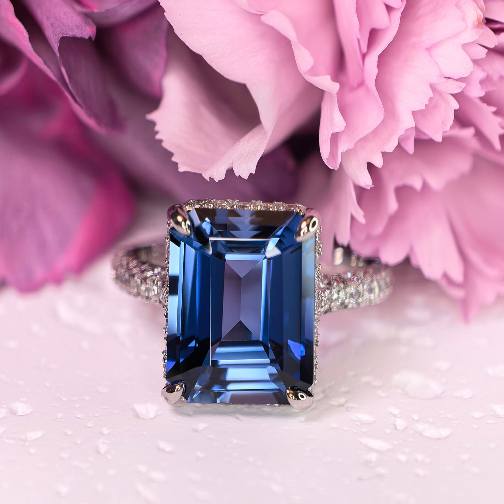 Hipnotyzujący, głęboki błękit i blask niczym z królewskiej szkatułki. Pierścionek Royal Blue to 10,12 ct szafir laboratoryjny w szlifie emerald, o czystości VVS1 w połączeniu z 78 diamentami laboratoryjnymi D–F/VS o łącznej masie 0,67 ct, oprawione w białe złoto 14K. Geometryczne fasety szlifu emerald wydobywają z kamienia hipnotyczną głębię koloru, a drobne brylanty ułożone w trzech rzędach na obrączce, a także okalające kamień rysują świetlistą poświatę, która podkreśla jego architektoniczną formę.