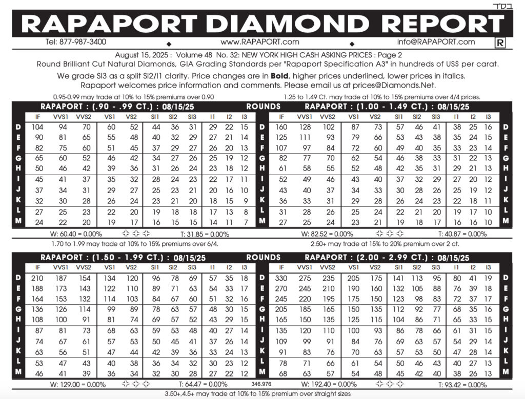 Rapaport jest podzielony na sekcje w zależności od masy diamentów: